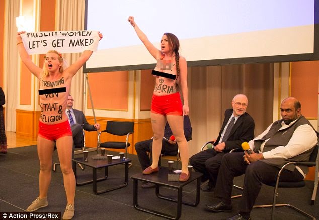Satu forum agama di Berlin bertukar menjadi kecoh apabila 3 wanita yang dipercayai anti islam bertindak 'menceroboh' forum itu tanpa memakai baju.